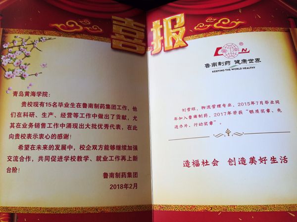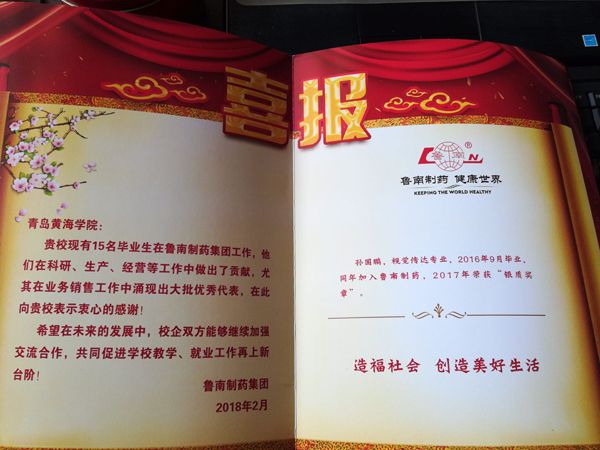 魯南制藥集團與我校一直保持著良好的校企合作關系,在對我校畢業生工作能力給予充分肯定的同時,也對我校在人才培養方面的能力給予很高的評價。公司在喜報中表示,我校現有15名畢業生在公司工作,他們在科研、生產、經營等工作中做出了貢獻,尤其在業務銷售工作中表現突出,特向學校表示衷心的感謝!希望在未來的發展中,校企雙方能夠繼續加強合作交流,共同促進學校教學、就業工作再上新的臺階。