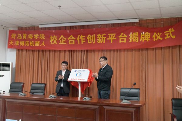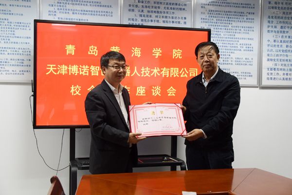 會后,我校梁希泉副校長和鄧教授一起為“校企合作創新平臺”揭牌,與鄧教授一行就人才培養、實驗室建設、技能大賽等方面進行了深入的座談交流,并聘請鄧三鵬教授為青島黃海學院特聘教授,頒發了聘書。