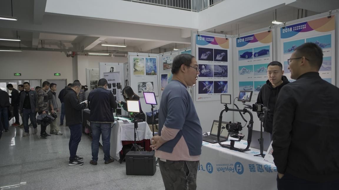 青島黃海學院校園行是影視工業網三年來第一次進高校,作為一場純公益活動,向同學們免費開放。本次活動分為兩個區域,一個是位于知韻樓三樓中廳的器材體驗區,26家攝影器材技術專家與同學們面對面接觸,一對一展示器材,學生們可以對一些前沿攝影器材進行體驗。另一個是位于知韻樓階梯三教室的知識交流區,技術專家們就這些一線器材的特點與使用方法給同學們做了詳細的講解。