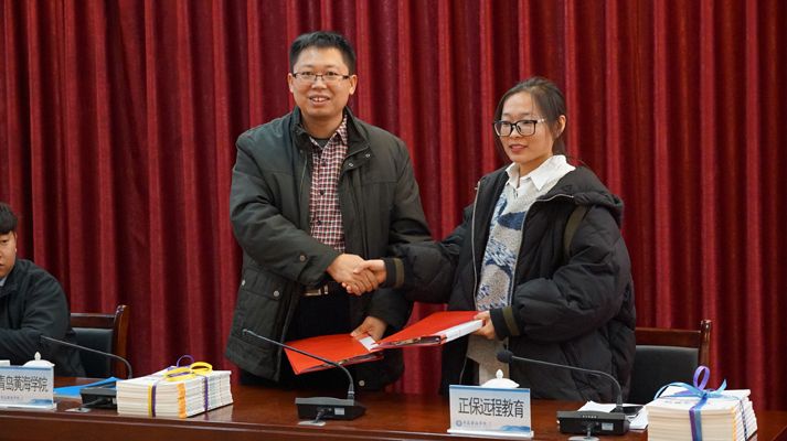 隨后,正保遠程教育集團校園業務部總監申燕瑞與我校財經學院副院長孫在福雙方簽署了助學協議,正保遠程教育集團校企合作經理曹波與青島黃海學院副校長梁忠環為本次“產學研合作基地”的建立進行揭牌。最后,正保遠程教育集團向財經學院師生贈送網課2573份,圖書1269冊,作為大學生助學計劃開展的第一步,并進行了贈書儀式。
