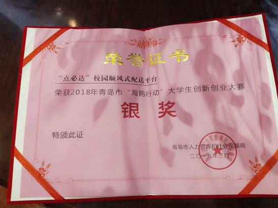 3月28日上午,財經學院、智能制造學院和建工學院15名同學組建的“點必達”團隊參加青島市2019年“海鷗行動”大學生創新創業大賽獲得銀獎。