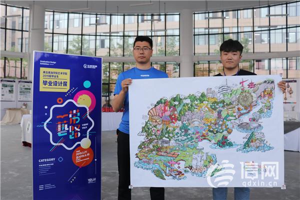 信網5月24日訊 走進黃海學院藝術學院畢業作品展廳,首先映入眼簾地是右手邊的一塊文創作品區域,在這方大概一平米的小天地里,擺放著水杯、抱枕、衣服等文創作品,最吸引人的當屬展區前方地上平放的一張特殊地圖,這里便是本次采訪的主角郭宇的作品展示區,而那張特殊的地圖,就是他用了半年的時間實地考察、創作修改而最終繪成的西海岸新區旅游地圖。