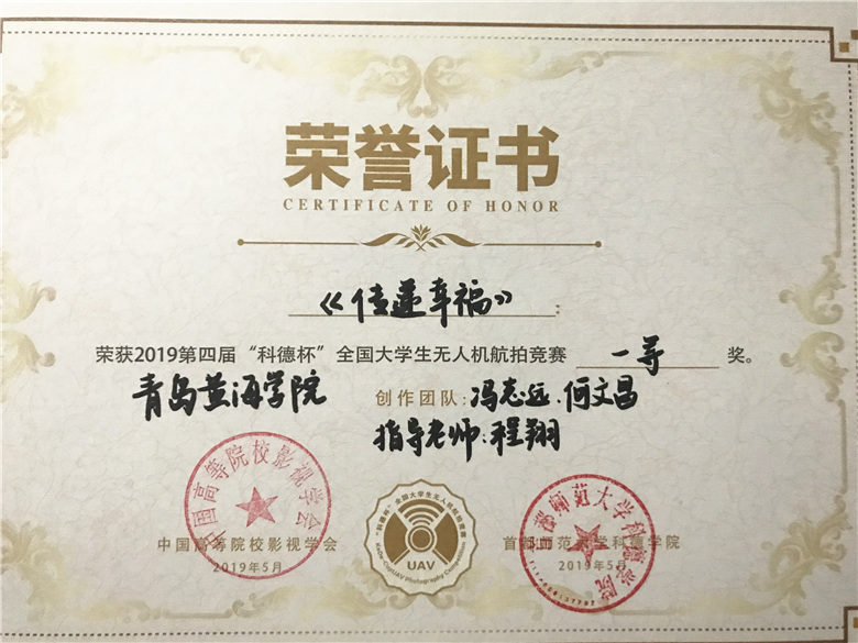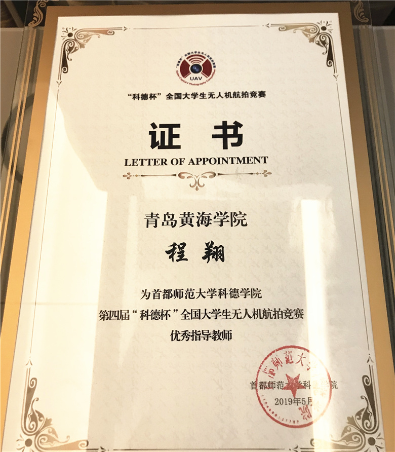 另外,藝術學院程翔老師榮獲本次賽事“優秀指導教師”獎。即將與大家見面的青島黃海學院2019年宣傳片的航拍部分,也是由程翔老師帶領學生完成的。
