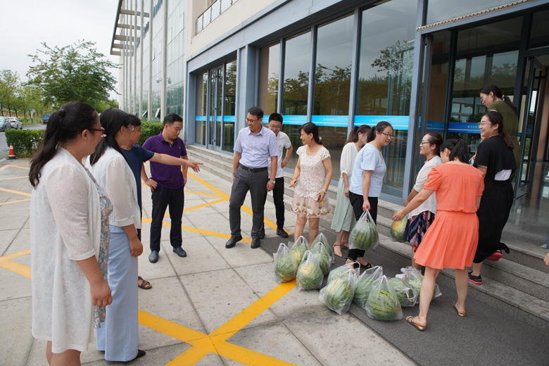 夏日中伏,青島持續高溫悶熱。 8月8日上午,校工會主席劉志強帶領綜合辦公室、組織人事部、紀檢監察處等部門負責人走進二級學院和職能部門,為酷暑下堅守在一線崗位的值班教職工送去了西瓜,讓他們在炎炎夏日感受到絲絲清涼,感謝他們不畏酷暑的辛勞工作,為學校發展作出的努力。