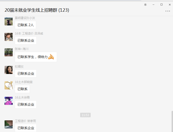 本次招聘會共邀請了29家單位,提供對口崗位283個,涵蓋了土木施工類、造價類、建筑軟件設計類等多個方向,滿足不同專業學生的需求。線上招聘會期間,企業有序發出招聘簡章,鼓勵學生積極聯系企業,27位同學發布了精心準備的具有明確求職意向的簡歷,經過兩個小時的線上招聘,所有發布簡歷的同學都收到了企業通過電話拋出的橄欖枝,后續面試也將在線上進行。經學院與企業協商,面試通過的同學,待疫情結束后即可辦理手續入職心儀的崗位。