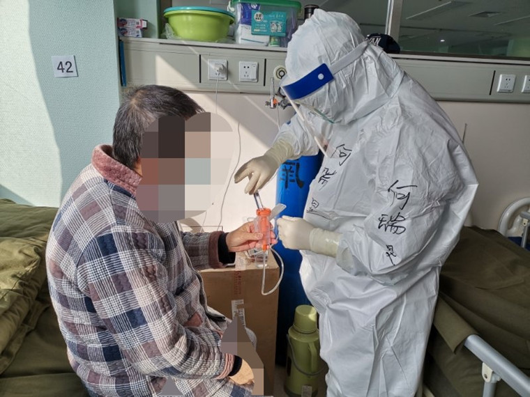 何瑞星每天的工作任務主要是按時給臥床的爺爺奶奶測量生命體征、輸液、幫助他們翻身拍背、換紙尿褲、定時消毒打掃衛生等。看似簡單的工作,有時做下來已經滿身大汗,護目鏡早已霧滿了水珠。除此之外,何瑞星還肩負起了心理醫生的責任,很多老人存在焦慮的情緒,影響康復進程。何瑞星會抽時間陪他們聊天,做心理疏導,幫助他們建立自信心。