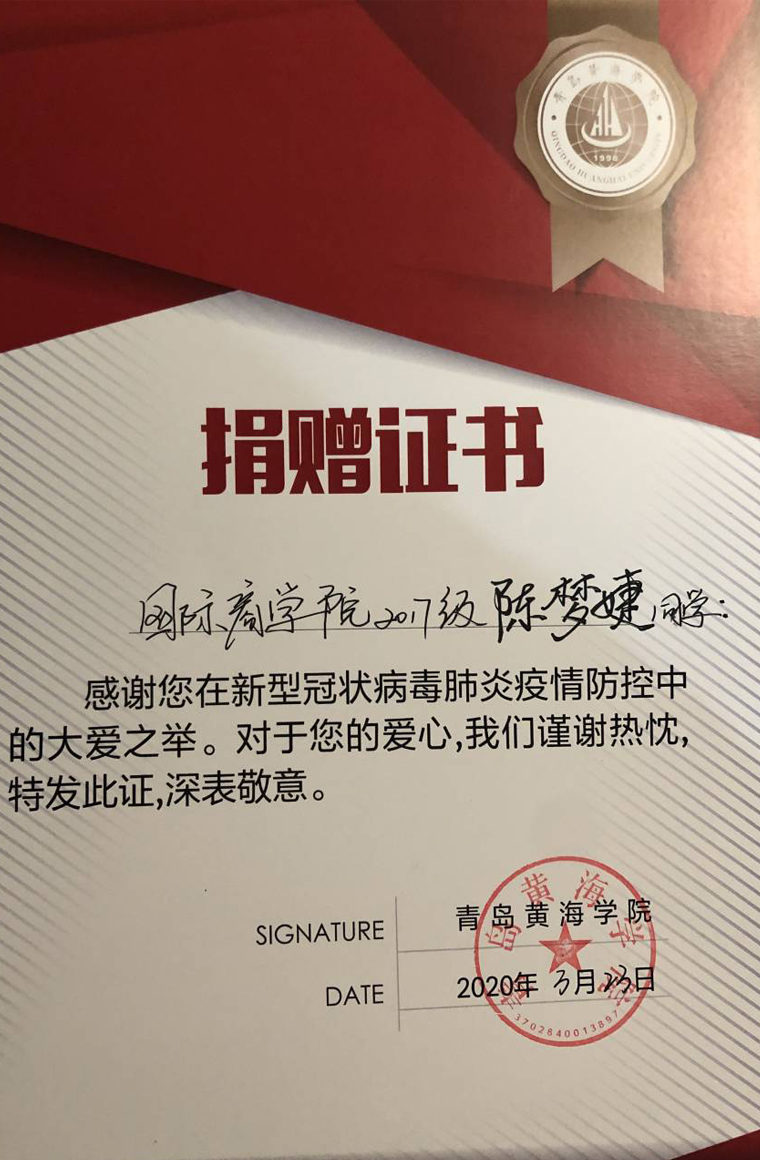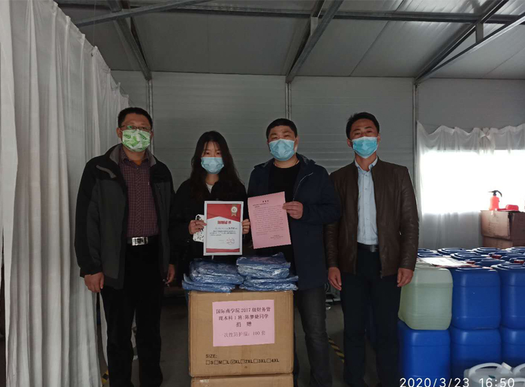 3月23日,國際商學院2017級財務管理本科1班的陳夢婕同學與家人一同趕到學校,向學校捐贈了100套一次性防護服,為學校的防疫物資準備貢獻了自己的力量。