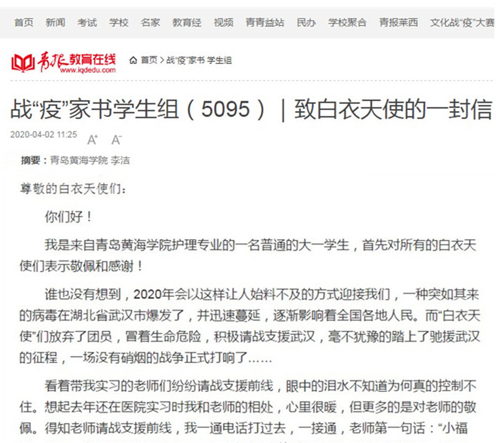 在由青島市委宣傳部、市文明辦、市衛健委、市教育局、青島日報社(集團)、學習強國青島學習平臺主辦,青島日報科教全媒體中心、青報教育在線承辦的《戰“疫”家書》征文活動中,護理與健康學院李潔同學的《致白衣天使的一封信》在青報教育在線榮獲刊登。