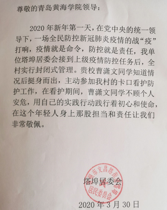 煙臺萊州塔埠村的曹瀟文是建筑工程學院的一名學生,在項目防疫物資緊缺之時,聯系相關部門自愿捐款400元,并主動申請在項目防疫一線工作,在門崗執勤測量來往人員體溫,為住戶送快遞等,堅決落實項目封閉式管理,盡力守護園區,得到了小區廣大業主及塔埠村居委會的一致好評。據了解,曹瀟文同學平時在校表現突出,具有很強的責任感和集體意識,經常參加公益活動。他心存善念,努力向上,在平凡的生活中閃閃發光。