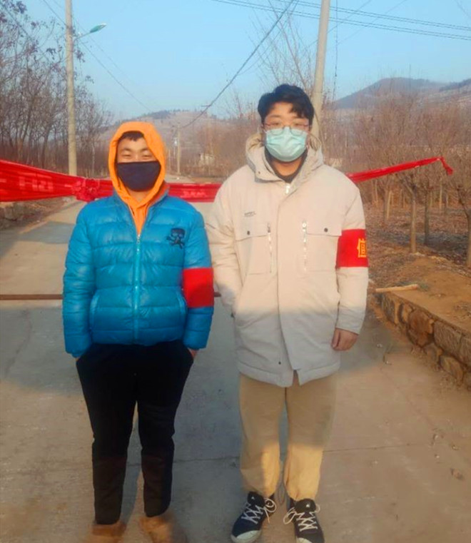 同樣挺身做志愿者的還有2017級專科班同學任國威。在了解到值班處人員不足的情況下,說服在家休班的朋友自2020年2月10日開始值班。在村里的街道路口設卡排查,對外來車輛和人員進行勸返,對本村的來往車輛進行登記,同時對周邊經過的村民進行防控知識宣傳。