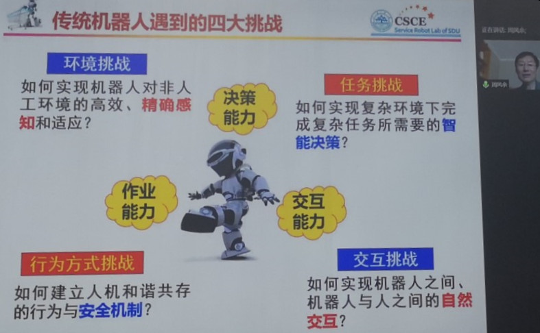 報告會共兩場,首先是山東大學周風余教授帶來的“工業4.0下的智慧工廠及未來機器人”,周教授首先簡要介紹了工業4.0提出的背景、內涵、設想;然后,詳細介紹工業4.0下智慧工廠的架構、工作流程、系統布局、信息物理系統CPS、標準規范;之后,分析了工業4.0下,傳統機器人技術存在的缺陷和不足,在環境、任務、交互和行為等方面所面臨的挑戰,提出了未來機器人的特點和必須要解決的四個基礎問題,并展示當前國際上最新的新一代機器人研究成果。