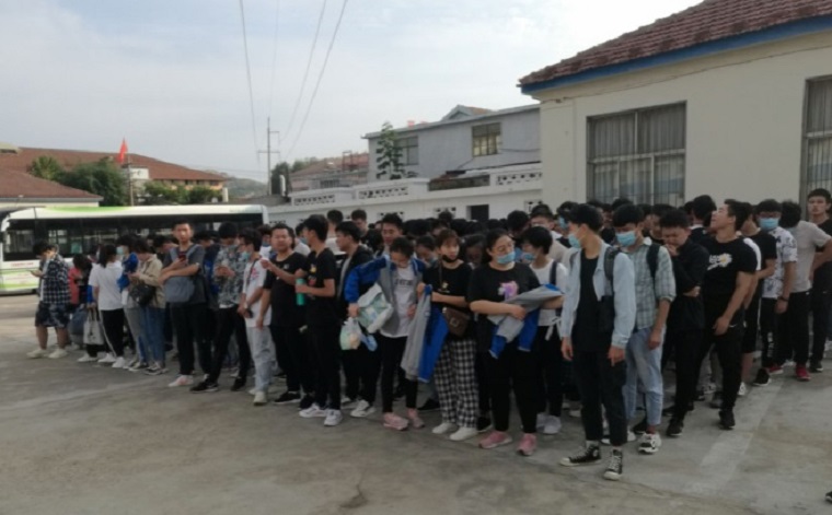 學生在一校南校區一號樓前統一坐車