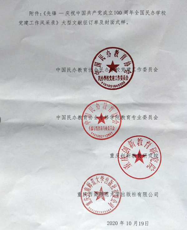 為隆重慶祝中國共產黨成立100 周年,中國民辦教育協會民辦學校黨建工作委員會聯合有關單位編輯出版《先鋒——慶祝中國共產黨成立100 周年全國民辦學校黨建工作風采錄》大型文獻。旨在以“抓黨建促民辦教育發展”為主題,認真總結全國民辦學校宣傳貫徹黨的路線方針政策,全面貫徹黨的教育方針,全面推進民辦學校黨的基層組織建設,教育管理黨員,引領服務師生,推動民辦教育事業發展的先進經驗。我校依據征稿啟事要求,積極組織投稿5篇。