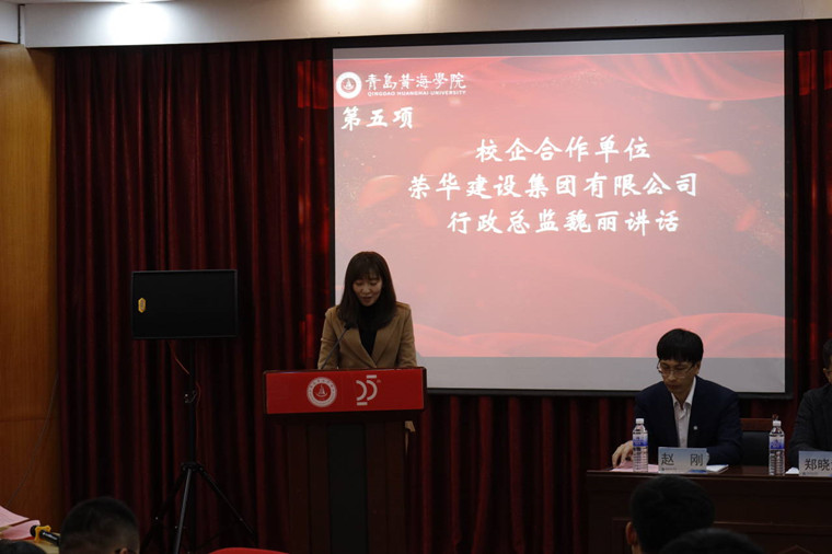 榮華建設集團有限公司行政總監魏麗致辭。魏麗總監首先祝賀已獲獎的同學們,憑借自己辛勤努力最終取得優異的成績。然后向在場人員介紹榮華建設集團近70年的發展歷史、人才管理優勢、以及所獲得的多項獎項。魏總監表示,習近平總書記曾強調“青春因磨礪而精彩,人生因奮斗而升華”。因此,她希望同學們能夠繼續持之以恒,不斷努力不斷進步,以奮斗書寫自己的人生。