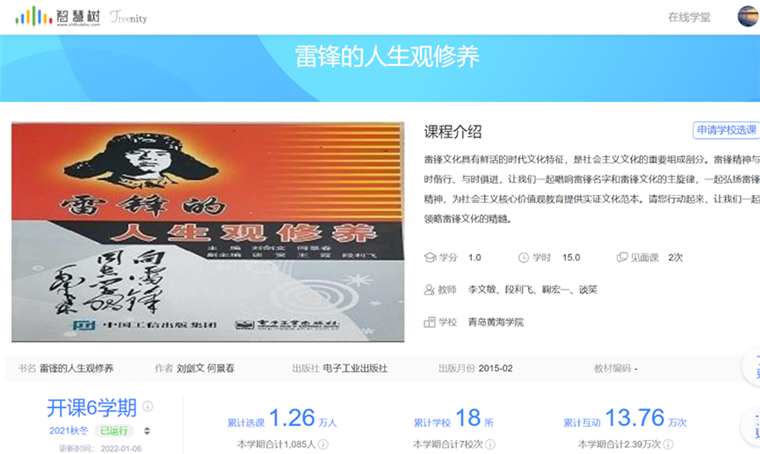 “雷鋒的人生觀修養”課程建于2019年11月,由李文敏、段利飛和鞠宏一3位教師主講,在智慧樹平臺上線運行,并于2020山東省高等學校在線開放課程平臺2020年第1批課程上線,面向各類高校和社會共享。