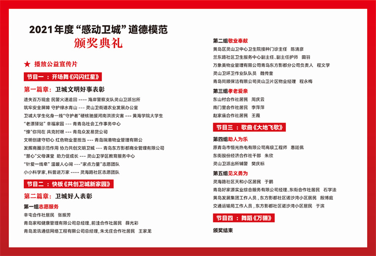凡人善舉傳遞道德力量,凝心聚力再創時代新功。12月30日下午, 2021年度“感動衛城”道德模范頒獎儀式在靈山衛街道舉辦,儀式現場對18名“衛城好人”、10件“衛城好事”進行了隆重表彰。學前教育學院藝術教研室朱姍姍、李雪倩老師受邀帶隊參與青島西海岸新區靈山衛街道道德模范頒獎典禮演出。