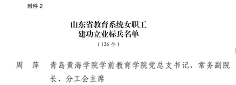日前,山東省教育工會委員會下發《關于表揚全省教育系統先進女職工集體和個人的通知》(魯教工〔2022〕7號),我校學前教育學院黨總支部書記周萍被授予“山東省教育系統女職工建功立業標兵”榮譽稱號。