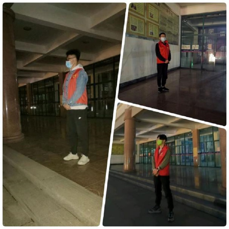 夜色降臨,教學樓里閃爍著稀疏的燈光,志愿者們依舊堅守在崗位上,帶著昂揚的心態站好最后一班崗,為一天的疫情防護活動做好收尾,并做好第二天的交班準備。