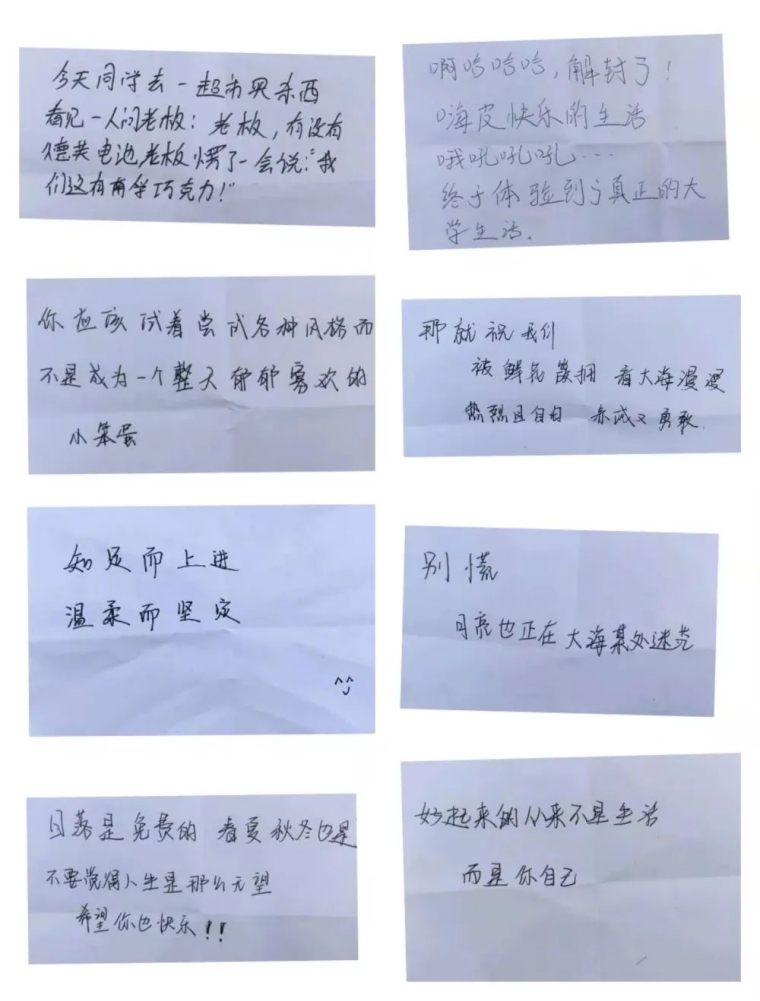 在活動現場,同學們紛紛拿起筆,在便簽紙上記錄自己的心聲。一張張便簽紙或被投放進“煩惱信箱”,或被投放進“快樂信箱”。“快樂信箱”里的便簽又被一張張抽走。展開快樂便簽,周圍的同學便湊了過來。未等讀完,大家就嘴角上揚,眼睛就笑成了一條線……