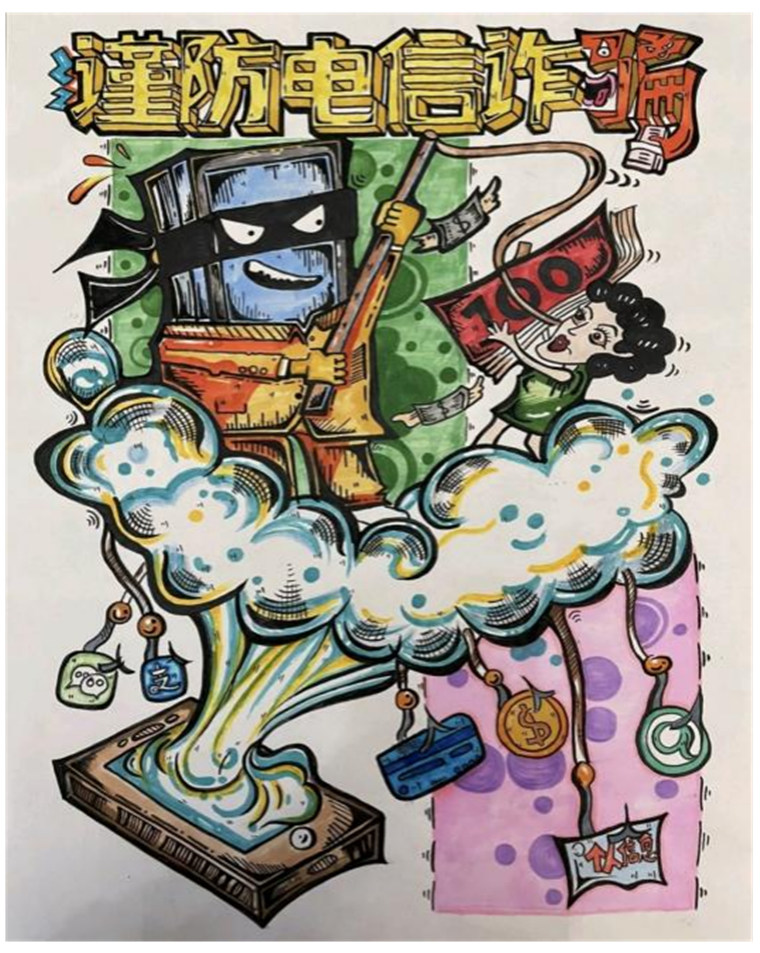 來自建筑工程學院的喬元金同學創作的《預防網絡詐騙,從我們做起》,他說:我曾經被不法分子欺騙過,體會過那種痛苦與氣憤,所以創作了這個作品,想讓其他同學引以為戒。
