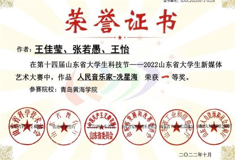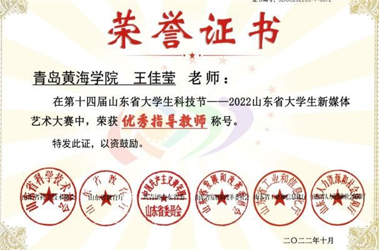 2022年11月,由山東省教育廳、山東省科學技術協會、共青團山東團委、山東省發展和改革委員會、山東省工業和信息化廳、山東省人力資源和社會保障廳聯合主辦的“第十四屆山東省大學生科技節——山東省大學生新媒體藝術大賽”的作品評選活動已落下帷幕。學前教育學院教師王佳瑩榮獲優秀指導教師稱號,指導學生報送作品《送你一朵東方茉莉(課件設計)》榮獲學生組課程課件設計類作品一等獎,與學前教育學院教師張若愚、王怡合作設計課件榮獲教師組課程課件設計類作品一等獎。