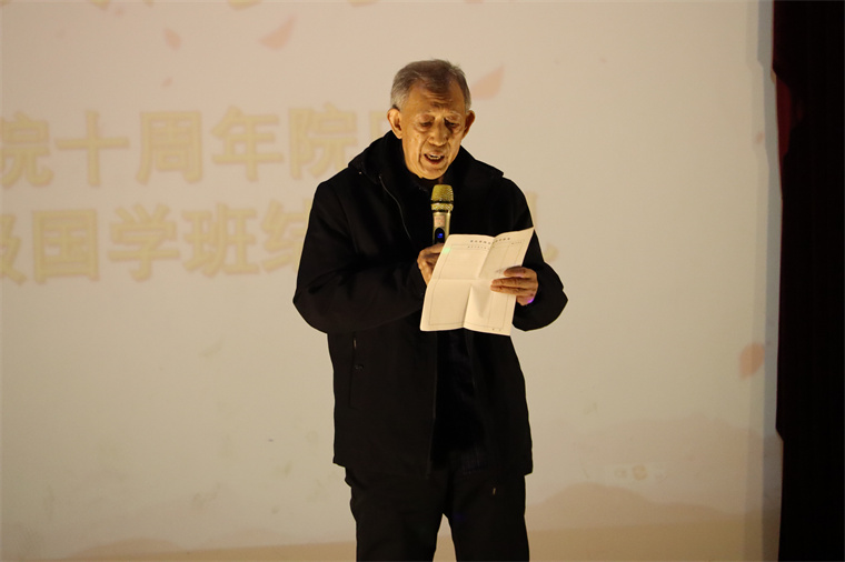 伴隨著名譽院長于善勤的發言,2019級國學班結業典禮把晚會帶入高潮。于善勤回顧了國學院十年發展歷程,表示國學院將乘著黨的二十大東風,以院慶為契機,不忘初心,不負使命,繼續續寫國學院發展新篇章,再創輝煌。隨后,國學院全體教師為2019級國學院畢業生代表頒發國學院結業證書,為2019級國學班“優秀班干部”“優秀學子”頒發榮譽證書。