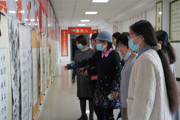 參展作品形式多樣、風格各異,囊括了篆書、隸書、楷書、行草書等多種字體以及寫意畫、寫實畫、工筆畫等多種畫法。幾十幅書畫作品鱗次櫛比地呈現書畫長廊,有的方圓兼濟、字體俊秀,有的字體縱橫揮灑、流暢遒逸,課間引來了許多路過的學生駐足欣賞。