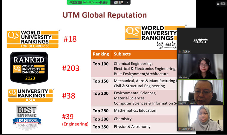隨后,zulkifli總經理對馬來西亞理工大學進行了詳細說明,包括地理位置、校區分布、發展歷史、專業設置、研究中心、學校聲譽等。馬來西亞理工大學1975年建校,在讀學生大約22000人,包括3000名以上的國際學生。在2023年QS世界大學排名中位列全球第203位,工程類專業世界排名39位。在學術交流方面與牛津大學、劍橋大學、清華大學等多所世界名校建立了廣泛聯系,與世界50多個學術機構進行合作與交流,連續多年被評為QS五星級大學。
