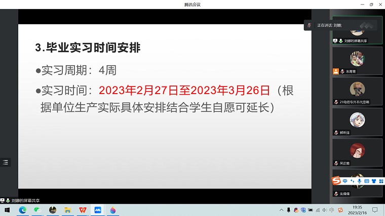為進一步完善2023屆畢業生實習工作,幫助學生做好實習前的各項準備,推進畢業生實習工作的順利進行。2月16日晚,電信工程系線上召開了2023屆畢業實習動員大會。電信工程系實習指導老師和2023屆電信專業全體畢業生參加了本次大會。