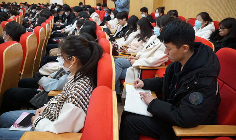 2月28日下午,在青島黃海學院知新樓西報告廳,“巾幗在行動 送法進校園”報告會——“我為同學送溫暖”主題活動正在進行。