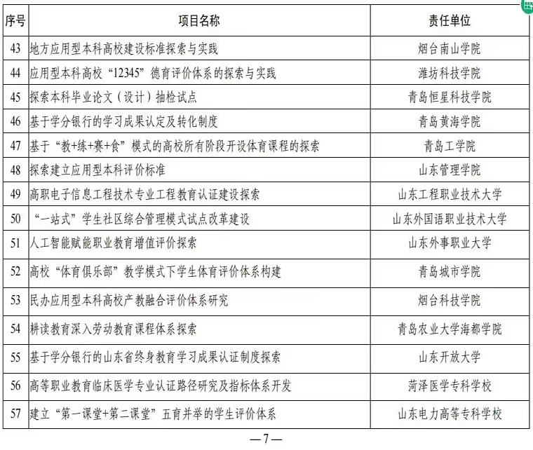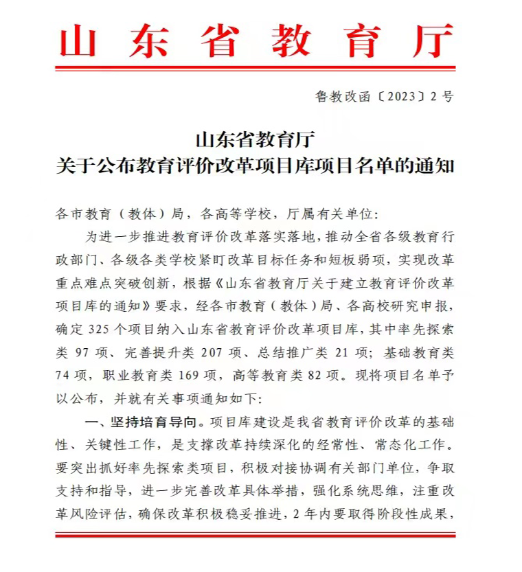 日前,山東省教育廳發布了“關于公布教育評價改革項目庫項目名單的通知”,我校申報的“基于學分銀行的學習成果認定及轉化制度”成功入選。