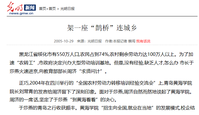 《光明日報》曾專門對此作了報道。那是2004年4月23日上午十時左右,一輛中巴車嘎然停在了學校教學樓的門廳前,一位女士信步走出車門,興奮的對迎接她的劉常青說:“周濟部長特意推薦我們到你們這兒參觀學習來了。”說罷又熱情地把同來的教育、勞動部門的同志一一介紹給校領導們。這位女士是誰?她此行的目的是什么?教育部部長又為何親自“牽線”呢?原來,這位女士是時任黑龍江省綏化市委副書記、市長于莎燕。地處黑龍江腹地的綏化市,農民占到74%,農村剩余勞動力達到100萬人,為了加速“農轉工”,市政府決定興辦大型勞動培訓基地。但是沒有經驗、缺乏人才怎么辦?于莎燕市長火速進京,向周濟部長“求賢問計”。而周濟部長就向于莎燕市長推薦了我校在農村勞動力轉移方面的經驗做法。于莎燕市長經過實地參觀考察,對我校的準軍事化管理、“訂單式”教育和校企結合等經驗非常贊同,盛贊青島黃海學院果然名不虛傳。她當即拍板提出了與我校聯合辦學的意向,得到劉常青的積極響應。學校愿為農民致富繼續貢獻黃海擔當。