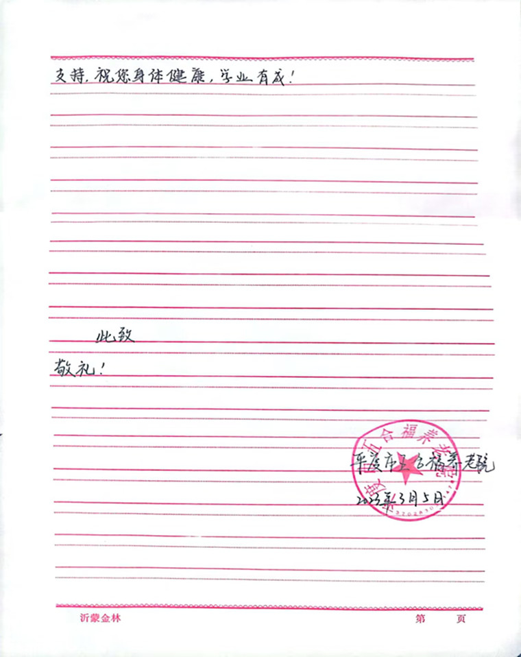 近日,青島黃海學院收到了一封來自平度市五合福養老院全體工作人員的親筆感謝信。字里行間里表達了對我校護理與健康學院曹莉莎同學在養老院期間愛老助老行為的感激和肯定,感謝她用耐心、愛心給老人們帶來了無限的歡樂和溫暖。