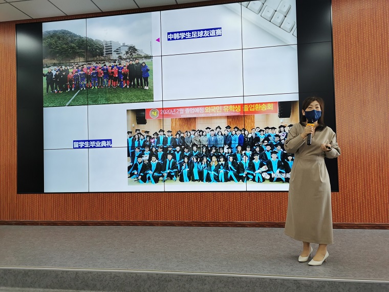 梁忠環首先對客人的到來表示熱烈歡迎,并簡要介紹了我校的辦學歷史、學院專業設置、師資力量以及中長期發展規劃。薛海勤副處長介紹了我校國際交流情況,回顧了我校與韓國湖南大學在疫情期間的友好緊密交流。孫皖怡首先對我校的熱情接待表示感謝,緊接著介紹了湖南大學的專業設置以及國際交流與合作的發展情況,表達了繼續擴大與我校合作交流的意愿。隨后雙方觀看了湖南大學的宣傳片。