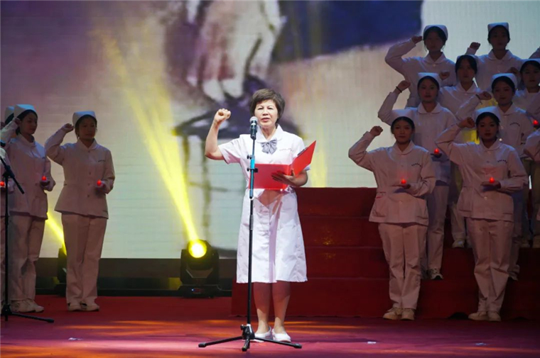 青島市中心醫療集團業務督導、教授、主任護師李兵暉帶領全體護理與健康學院學生在南丁格爾畫像前莊嚴宣誓。大家握拳過肩,鏗鏘有力的誓言在搖曳的燭光中蕩漾,莊嚴的氛圍感染了在場的每一個人。