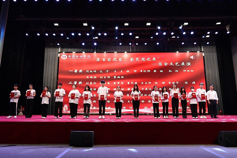 本輪表演結束后,大數據學院院長助理李宗峰、藝術學院院長助理杜超、經濟管理學院院長助理劉政義、國際商學院院長助理劉奕蔓為在以下四項比賽中獲獎的同學們頒獎,分別是:“集百家之長,薈靈思之萃”—宿舍文藝展演(15人)、“悠悠墨香,寓見美好”—宿舍征文活動 (15人)、“寓”有大愛,“宿”說精彩—校園微視頻大賽 (15人)、“我以我手執新筆,我以我心繪我寢”—公寓設計大賽(15人)。