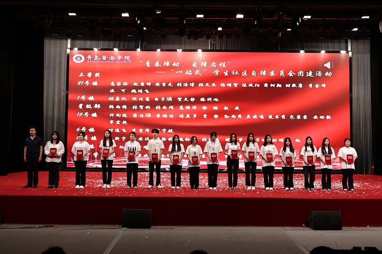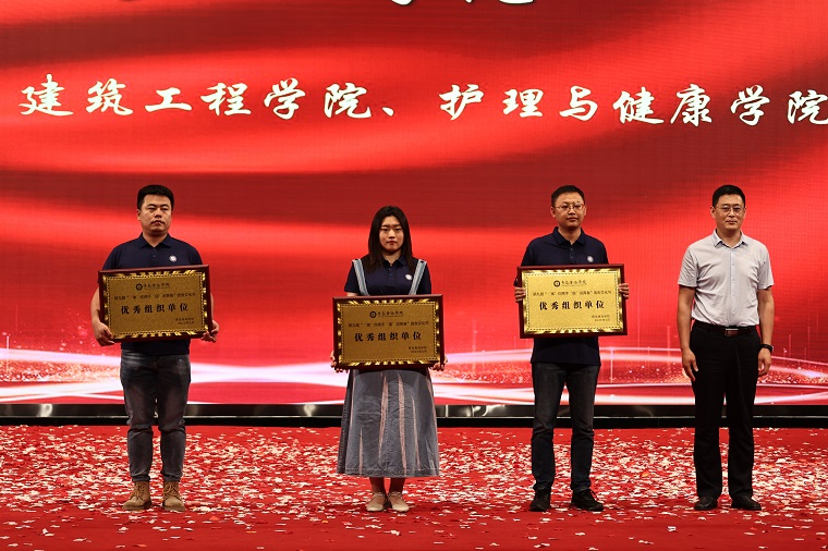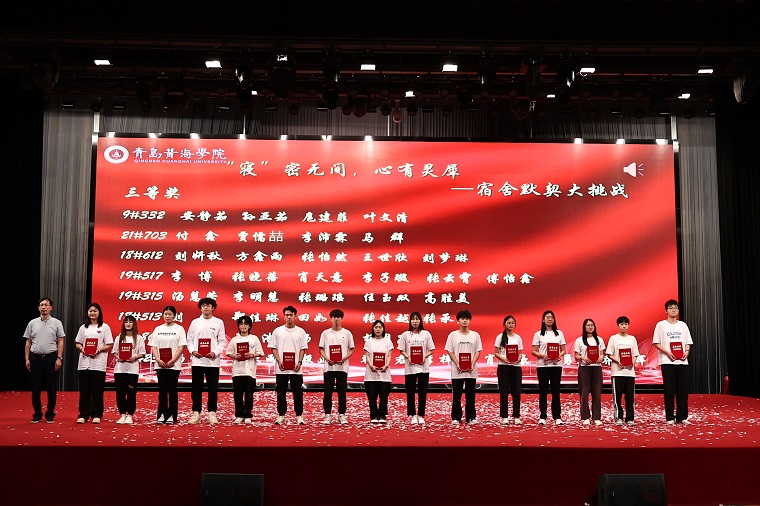 表演結束后,護理與健康學院院長助理孫延賀、建筑工程學院院長助理趙剛、藝術學院常務副院長孫兆忠為在以下三項各項目中獲勝的個人和集體頒獎,分別是:“衣”筆點睛,怦然“新”動—文創PoLo衫大賽 (共15人)、“寢”密無間,心有靈犀—宿舍默契大挑戰 (共15人)、“青春律動,自律啟程”—自律委員會團建系列活動 (共15人)。