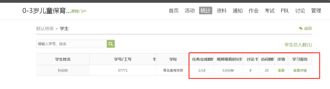 會看到具體學習情況,該功能可進行實施查看與監督。(后臺擁堵時會出現數據延遲)